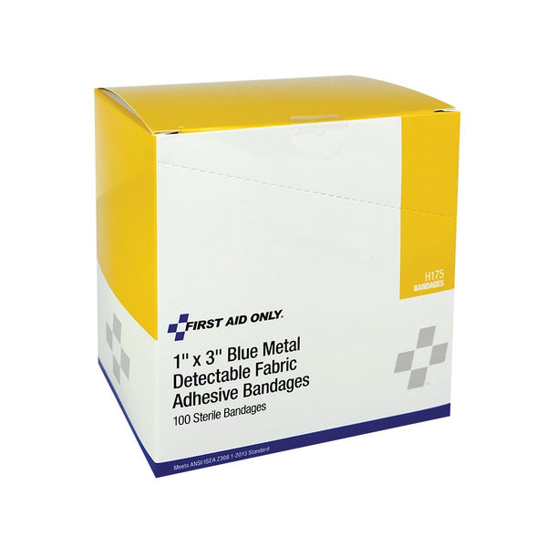 • First Aid Central Adhesive Blue Metal Detectable Fabric Bandages, 2.5 x 7.6cm (1"x3"), 100/Box