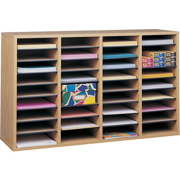 36 Compartment(s) - 36 Shelf(ves) - Compartment Size : 2.50" (63.50 mm) x 9" (228.60 mm) x 11.50" (292.10 mm) - 24" (609.60 mm) Height x 39.3" (998.22 mm) Width x 11.8" (298.45 mm) Depth - Adjustable Compartment, Adjustable Shelf - Laminate - Oak, Black - Wood, Fiberboard, Laminate, Plastic - 1 Each