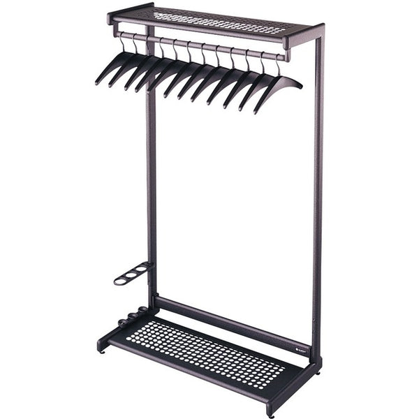 Single-sided freestanding garment rack features a top and bottom shelf for double the storage space